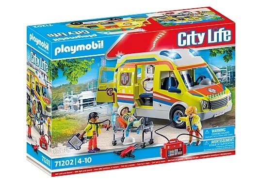 Nowoczesna karetka z modułem świetlno-dźwiękowym, który wymaga trzech baterii mikro 1,5 V (brak w zestawie) oraz z dużą ilością akcesoriów do opieki nad poszkodowanym pracownikiem budowlanym. Światło i dźwięk można włączyć i wyłączyć za pomocą przycisku na dachu, który jest zdejmowany. W kabinie kierowcy jest miejsce dla 2 figurek. W tylnej części pojazdu znajduje się rozkładane siedzenie. Dopracowane w najmniejszych szczegółach zabawki systemowe PLAYMOBIL wspierają rozwój kreatywności, pobudzają procesy analityczne i intelektualne oraz sprawność manualną maluchów.