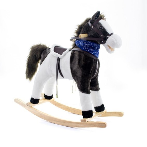 Zabawka wykonana z bardzo miłego w dotyku materiału. Konik posiada wygodne siedzisko ze strzemionami i lejcami oraz drewniane rączki. Zabawka po naciśnięciu ucha wydaje różne dźwięki i rusza ogonkiem i mordką.