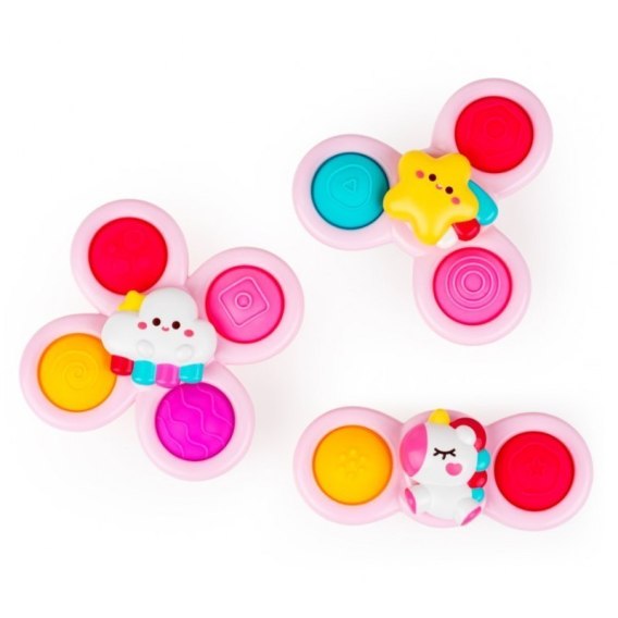 Kręć i wciskaj, gdzie tylko zechcesz! Zestaw trzech uroczych zabaweczek dostarczy wesołej rozrywki w dowolnym miejscu. Każda z zabaweczek posiada kolejno dwa, trzy lub cztery kolorowe pola do wciskania, z wytłoczonymi kształtami. Zabawa polega na przepchnięciu kuleczek na drugą stronę zabawki, a następnie wypchnięciu ich z powrotem do góry. W zestawie znajdują się praktyczne przyssawki, dzięki którym bez trudu przymocujesz zabawkę do dowolnej czystej i gładkiej powierzchni. Po przymocowaniu, można kręcić nią za pomocą paluszka.