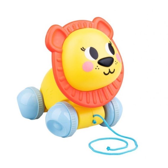 Cztery kółka, ruda grzywa, a do tego głową kiwa! Ten wesoły zwierzak zabawi najmłodszych na kilka różnych sposobów. Można go prowadzić na sznureczku, aby jechał, zabawnie kręcąc przy tym głową. Lew posiada specjalne kółeczka o nieregularnym kształcie, co zapewnia ciekawy efekt wizualny. Dodatkowo, można je rozpędzić, aby postawiony na podłodze zwierzak pojechał samodzielnie do przodu. Na boku lwa znajduje się kolorowy kwiatek, który przy przesuwaniu wydaje terkoczący odgłos.