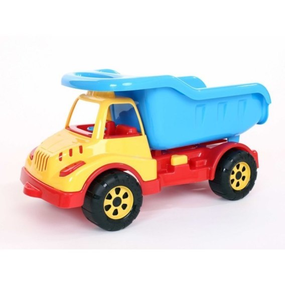 Ciekawy samochód ciężarowy z kolorowego plastiku do zabawy zarówno w domu jak i na podwórku. Posiada wiele intrygujących elementów, które zaciekawią każde dziecko takich jak mini kierownica ciekawie zaprojektowana kabina samochodu oraz odchylana wywrotka.