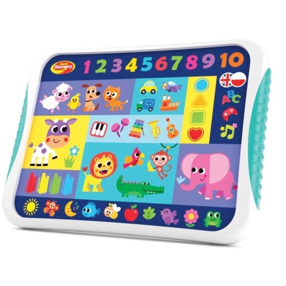 Dotykowy tablecik nauczy malucha pierwszych słówek i to od razu w dwóch językach! Zabawka wypowiada słowa z różnych grup tematycznych, a są wśród nich kolory, pojazdy, instrumenty muzyczne, figury, cyferki i zwierzątka. Aby usłyszeć wymowę danego słowa, wystarczy nacisnąć na odpowiedni obrazek. Poza funkcją zmiany języka, tablet posiada też tryb gry, w którym zadaniem dziecka będzie wskazać odpowiedni obrazek, do którego odnosi się wypowiadane słowo lub dźwięk. A po nauce, na najmłodszych czeka zabawa. W trybie piosenek, maluch usłyszy edukacyjne piosenki, a tryb melodie zabawi go wesołą muzyką.