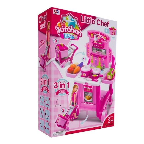 Stolik-wózek z kuferkiem - kuchnia dla najmłodszych kucharzy. Zapewni dziecku wiele godzin rozrywki i rozwinie u niego koordynację wzrokowo-ruchową oraz abstrakcyjne myślenie. Pozwala na zabawę dziecka z rodzicem. Stolik po złożeniu może być wózkiem. Zestaw zawiera duży kuferek, do którego można spakować wszystkie akcesoria.