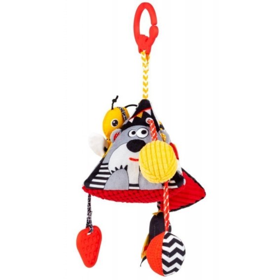 Kontrastowa zawieszka ucieszy oczko i zajmie łapki malucha sensoryczną zabawą! Wśród kryjących się tu niespodzianek, na bobasa czeka bezpieczne lusterko do samopoznania, piszczałka, gryzaczek, który przyniesie ulgę podczas ząbkowania, i tasiemka do przeciągania. Na jednym z jej końców znajduje się urocza pszczółka, która ma tu swój własny domek - kieszonkę w kształcie plastra miodu. Zabawka wykonana została z materiałów różniących się wzorem i fakturą, które stymulować będą zmysły malucha, zachęcając go tym samym do sensorycznego odkrywania świata. Praktyczna zawieszka pozwoli zawiesić piramidkę w dowolnym miejscu, aby mogła towarzyszyć bobasowi w każdej sytuacji.