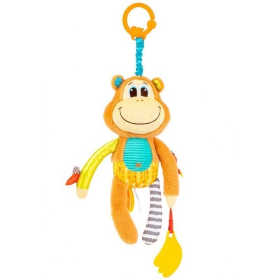 Wesoły małpiszonek rozbawi bobasa, a gdy przyjdzie pora drzemki, zagra do snu uroczą kołysankę. Zabawkę zdobi miękki gryzaczek w kształcie kiści bananów, który z pewnością przyda się każdemu ząbkującemu maluchowi. Małpka uszyta została z materiałów o zróżnicowanych kolorach, wzorach i fakturach, dzięki czemu stymuluje zmysły dziecka, inspirując go do sensorycznego odkrywania świata. Aby uruchomić pozytywkę, wystarczy pociągnąć kółeczka, znajdujące się w miejscu małpiego ogonka. Zabawka wyposażona jest w praktyczną zawieszkę, dzięki której przymocujesz małpkę w dowolnym miejscu, aby wszędzie mogła towarzyszyć dzidziusiowi.